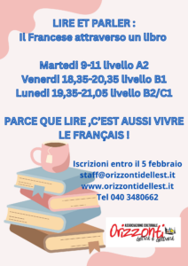 - Le novità dal 23 febbraio :Vuoi migliorare il tuo francese leggendo un romanzo avvincente ? Condividere il piacere della lettura, discutere in francese e vivere la lingua attraverso la letteratura ? Partecipa allora al nostro corso : Lire et Parler- il francese attraverso un libro. PARCE QUE LIRE ,C’EST AUSSI VIVRE LE FRANÇAIS -corsi in presenza