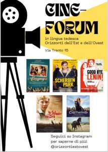 - Cineforum – Film in lingua tedesca –Un viaggio nel cinema tedesco tra emozione, storia e ironia!A partire da gennaio vieni a scoprire il cinema tedesco, tra cultura, società, sport, storia e tante emozioni. Ogni mese ci incontreremo nella nostra sede per guardare insieme uno dei film che ha fatto la storia della cinematografia tedesca. Dove: Orizzonti dell’Est e dell’Ovest, Aula 2, Orario: dalle 20:30